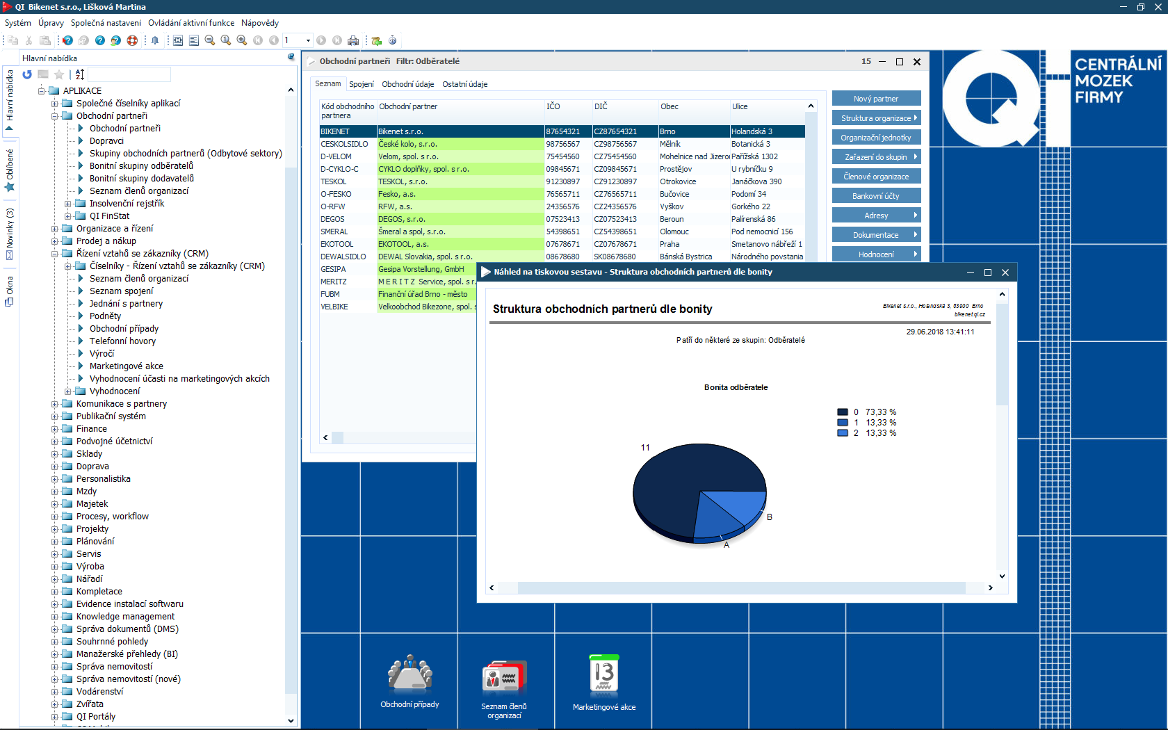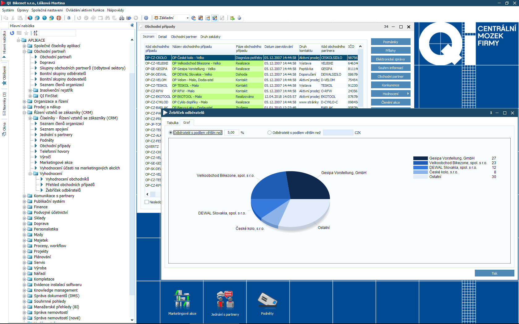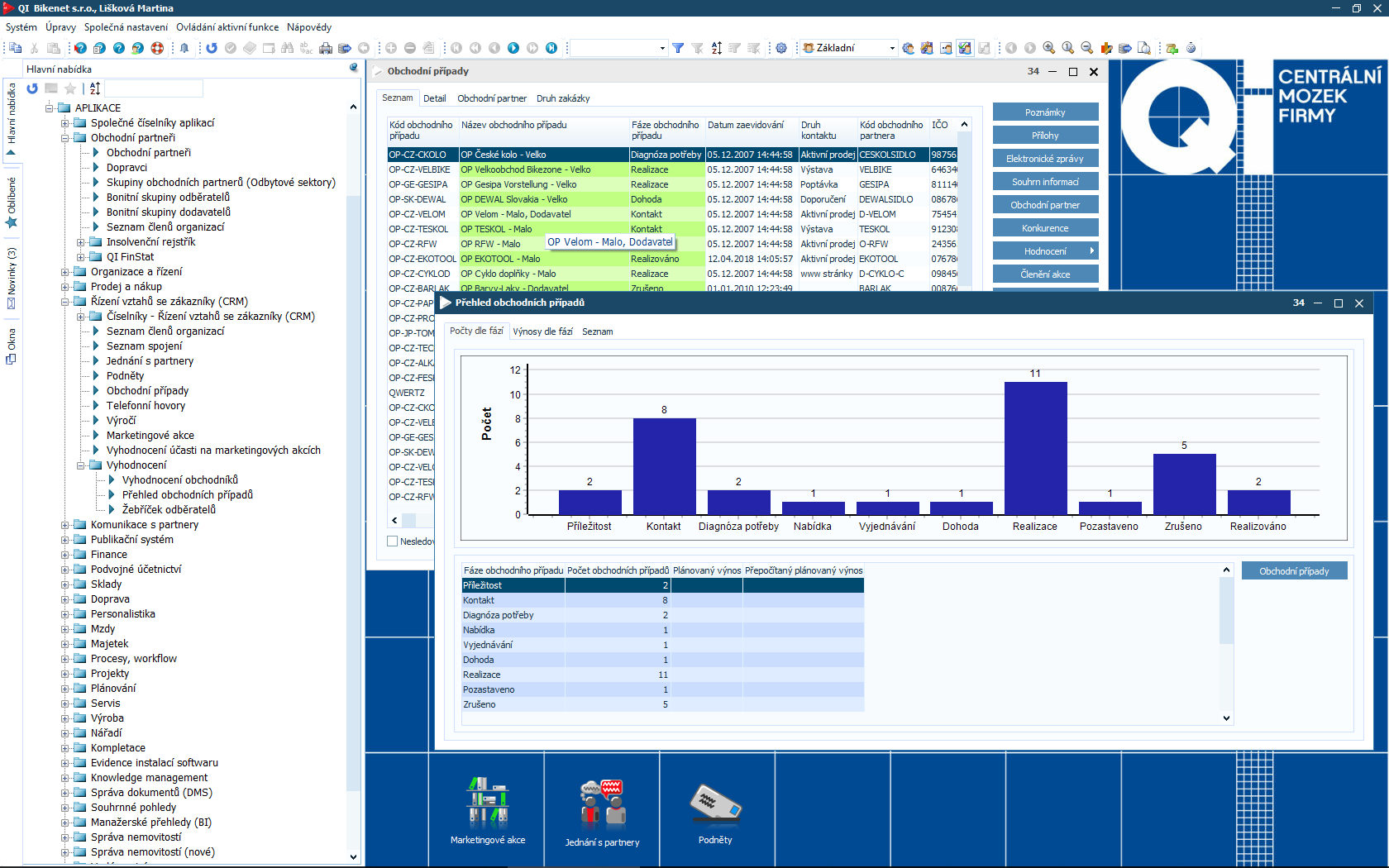Čím více informací o partnerech i zákaznících máte, tím lépe pro Vaši firmu. Samotná data Vám ale bez kvalitního vyhodnocení neposkytnou požadované odpovědi. Proto je součástí informačního systému QI modul CRM a marketing, který Vám pomůže zpracovat údaje o zákaznících, identifikovat potřeby trhu a stanovit manažerská rozhodnutí. Podpoří také organizaci a vyhodnocení různých typů akcí.