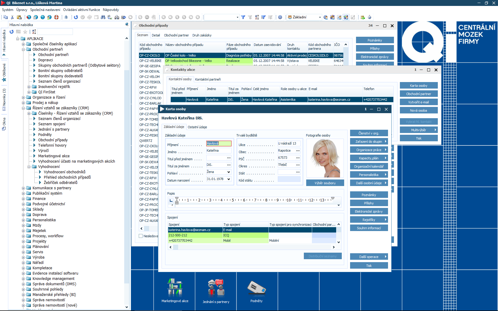 - Kontakty (osoby, obchodní partneři) a jejich spojení (mobil, e-mail apod.)