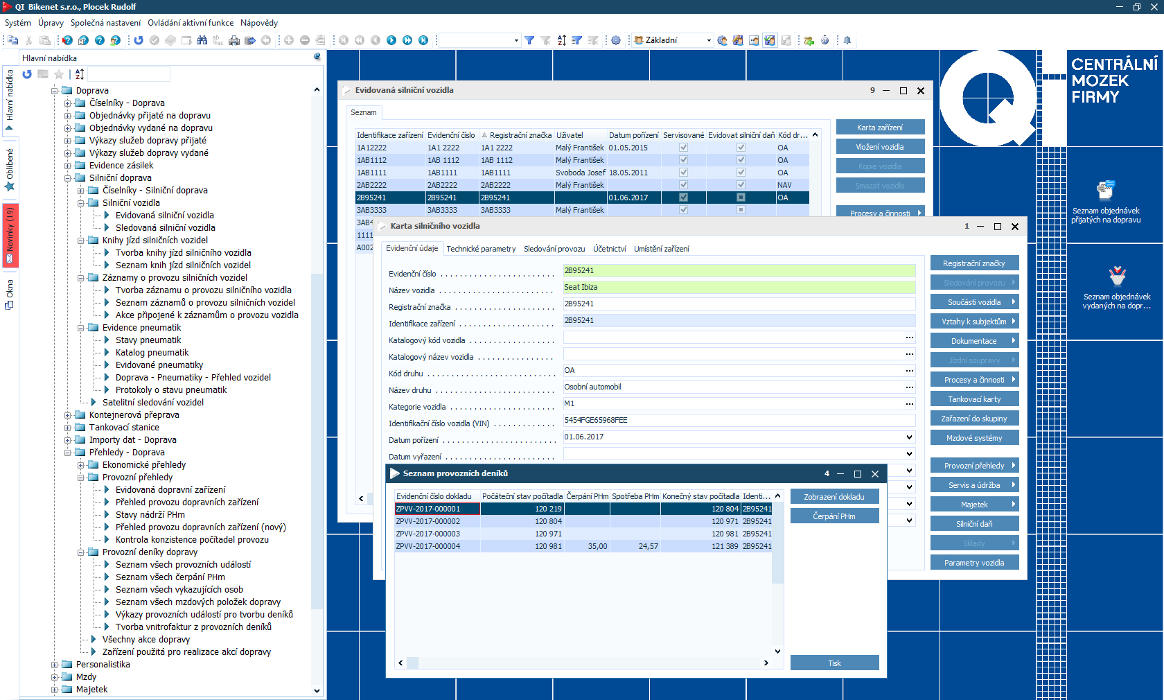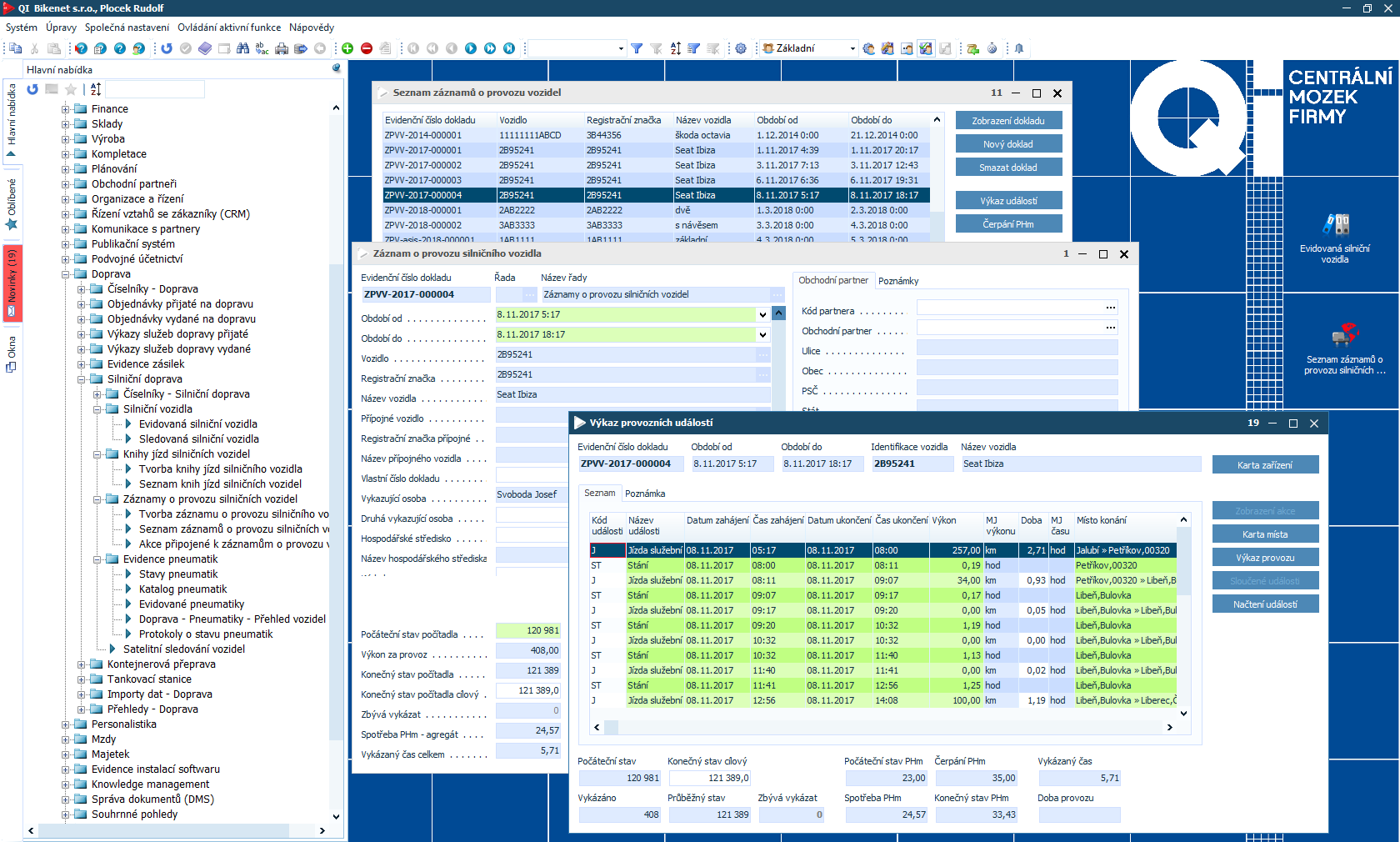 Modul zahrnuje přehled o ujetých kilometrech, přesném pohybu vozidla a spotřebě pohonných hmot, díky tomu snadno vyčíslíte náklady na ujetý kilometr. Tuto provozní část je možné v systému propojit s obchodní a účetní agendou, proto je vytváření dokladů v QI jednoduché a rychlé: například spediční firmy mohou přijaté objednávky provázat se stazkou nebo přímo ze stazky tvořit fakturu. Z provozního deníku snadno vygenerujete cestovní výkazy (ty lze jedním kliknutím přiřadit k již v systému zaevidované služební cestě). Bez obtíží také připravíte dodací listy nebo výkazy služeb.