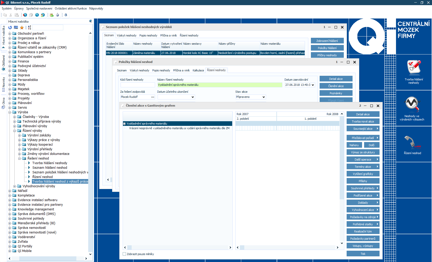 Modul zajišťuje kontrolu kvality produktů prostřednictvím měřicích protokolů. V těchto formulářích zaznamenáte kvalitu celého výrobku i jeho jednotlivých částí. Zároveň je možné sledovat a evidovat neshody ve výrobě. QI okamžitě vystavuje výkazy zavinění, na jejich základě je pak snadné založit nápravná opatření (například servisní zásah, novou zakázku). Naopak ověřené výrobní postupy lze přenášet do dalších procesů v rámci celé výroby.