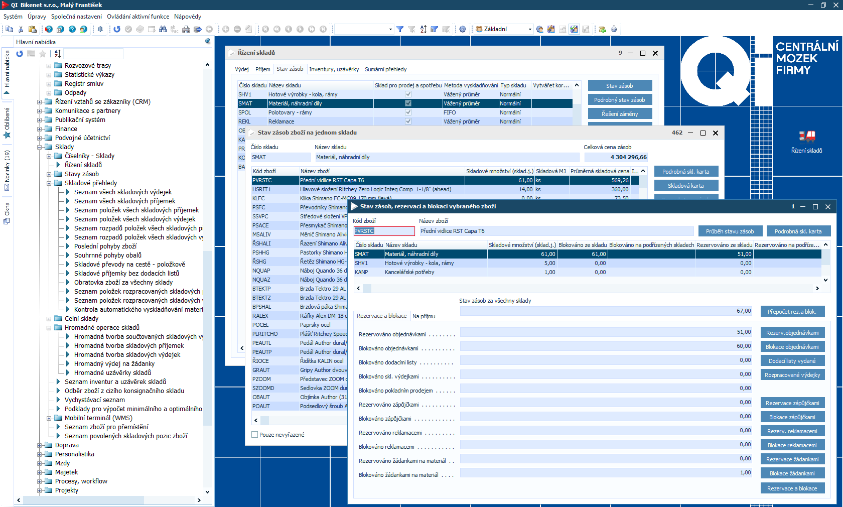 Informační systém dokáže automaticky upozornit na rezervaci zboží. Produkty také můžete blokovat – v tomto případě je QI nedovolí vyskladnit pro dalšího odběratele. Blokaci lze ručně zrušit na úrovni objednávky a zboží připravit pro jiného klienta. Systém také zajišťuje postupné vychystání zboží. Objednávky jsou tříděny dle data požadovaného dodání a při výběru je možné operovat s trvanlivostmi tak, aby byly přednostně zpracovány starší skladové položky.