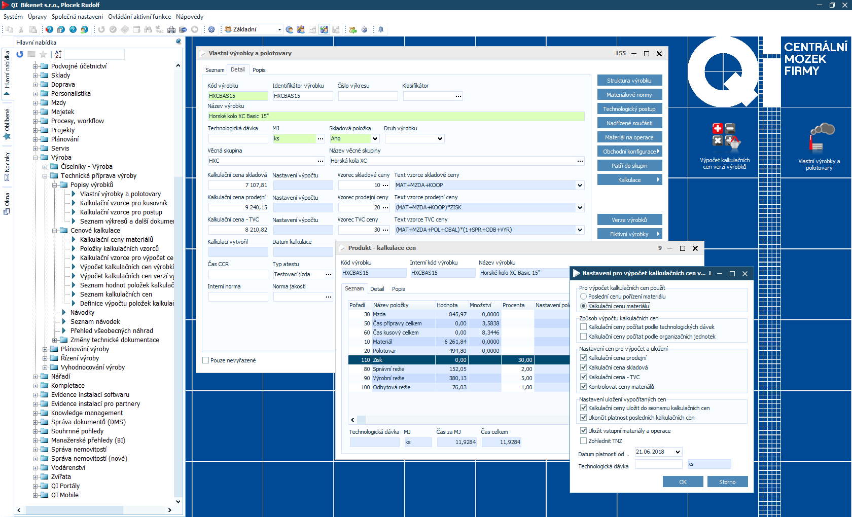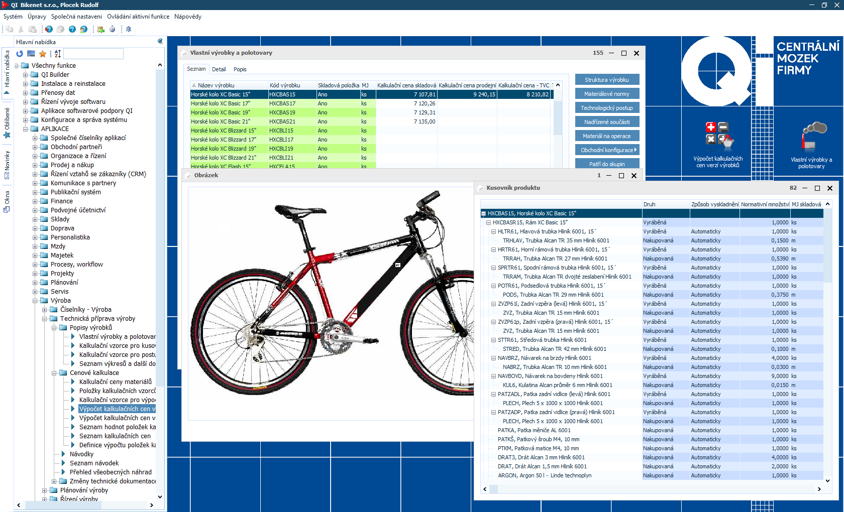 V QI můžete evidovat neomezené množství různých výrobků. Přímo v systému lze definovat vzhled produktu, jeho přesné složení i jednotlivé operace (ke každé je k dispozici odpovídající technologický postup) včetně přípravného i kusového času. Díky tomu vedení získá informace o vytížení konkrétního pracoviště. QI také eviduje všechny potřebné materiály, vždy je možné vypočítat jejich spotřebu. Na to navazují předvýrobní kalkulace. Zjistíte, zda produkt dokážete vyrobit v přijatelné hodnotě a snadno porovnáte plánované náklady se skutečnými. Nákladové ceny lze promítat přímo do nabídek. V QI můžete tvořit vlastní kalkulační vzorce pro koncovou prodejní cenu.