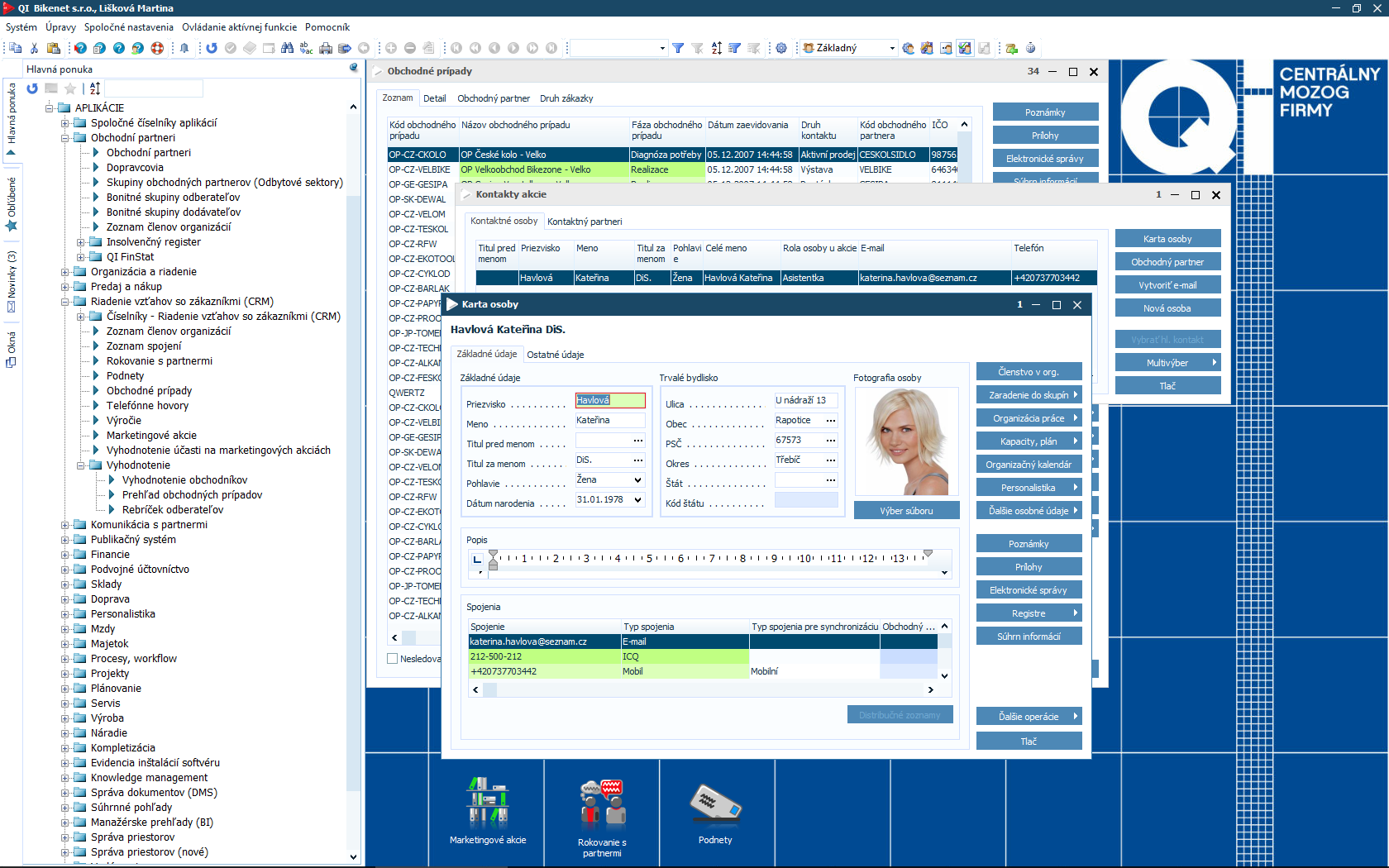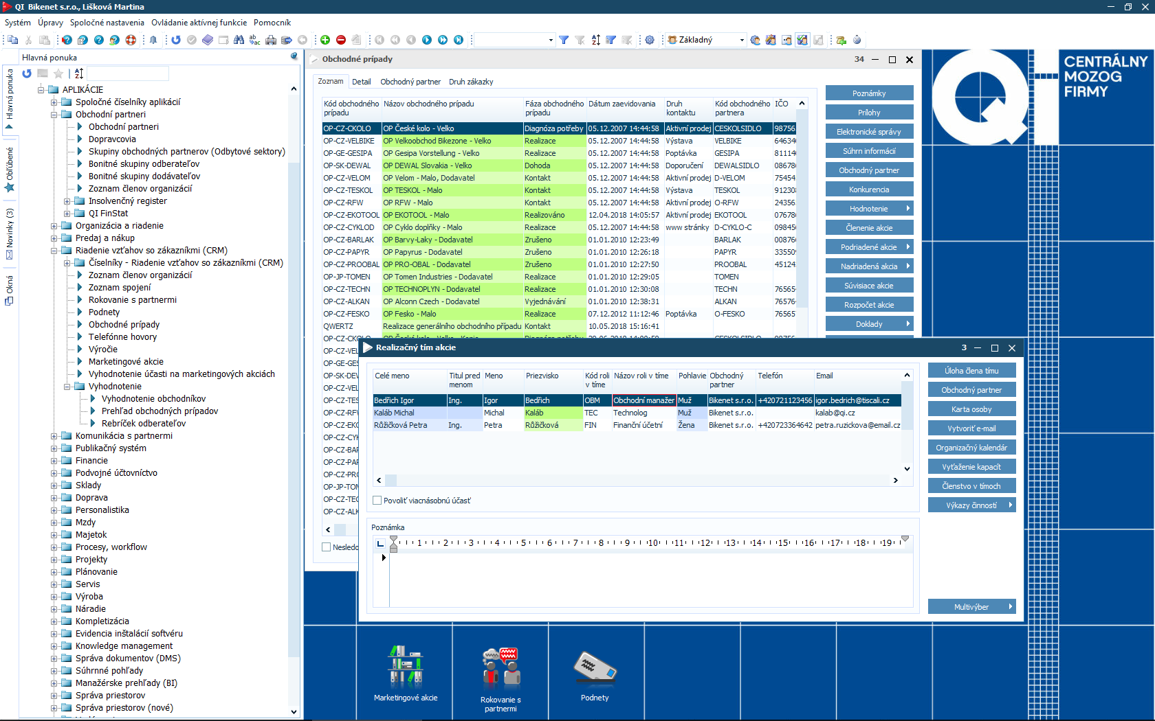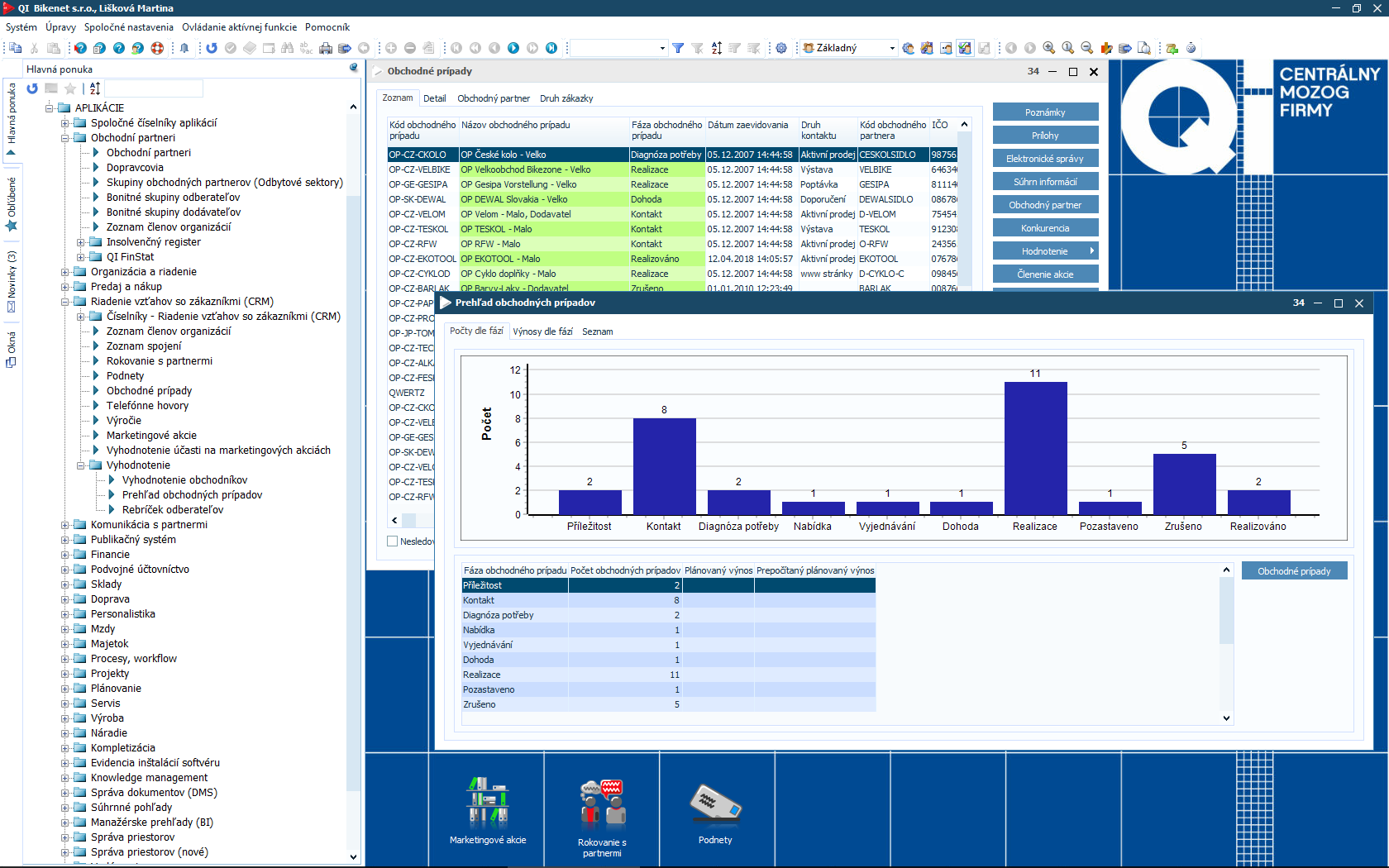 Čím viac informácií o partneroch aj zákazníkoch máte, tým lepšie pre Vašu firmu. Samotné dáta Vám ale bez kvalitného vyhodnotenia neposkytnú požadované odpovede. Preto je súčasťou informačného systému QI modul CRM a marketing, ktorý Vám pomôže spracovať údaje o zákazníkoch, identifikovať potreby trhu a stanoviť manažérske rozhodnutia. Podporí aj organizáciu a vyhodnotenie rôznych typov akcií.