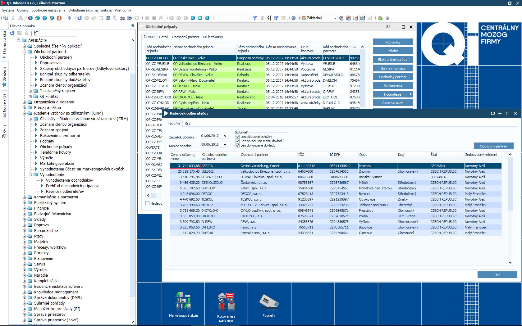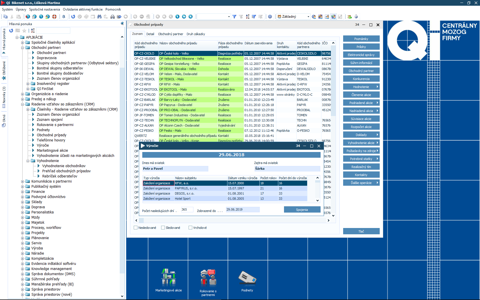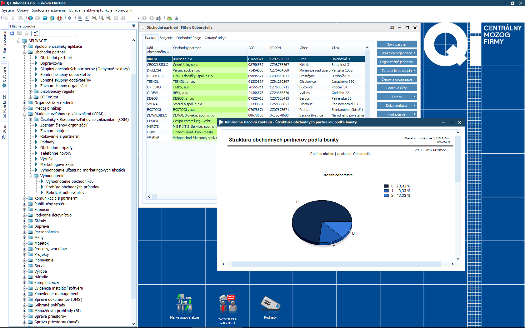 Čím viac informácií o partneroch aj zákazníkoch máte, tým lepšie pre Vašu firmu. Samotné dáta Vám ale bez kvalitného vyhodnotenia neposkytnú požadované odpovede. Preto je súčasťou informačného systému QI modul CRM a marketing, ktorý Vám pomôže spracovať údaje o zákazníkoch, identifikovať potreby trhu a stanoviť manažérske rozhodnutia. Podporí aj organizáciu a vyhodnotenie rôznych typov akcií.