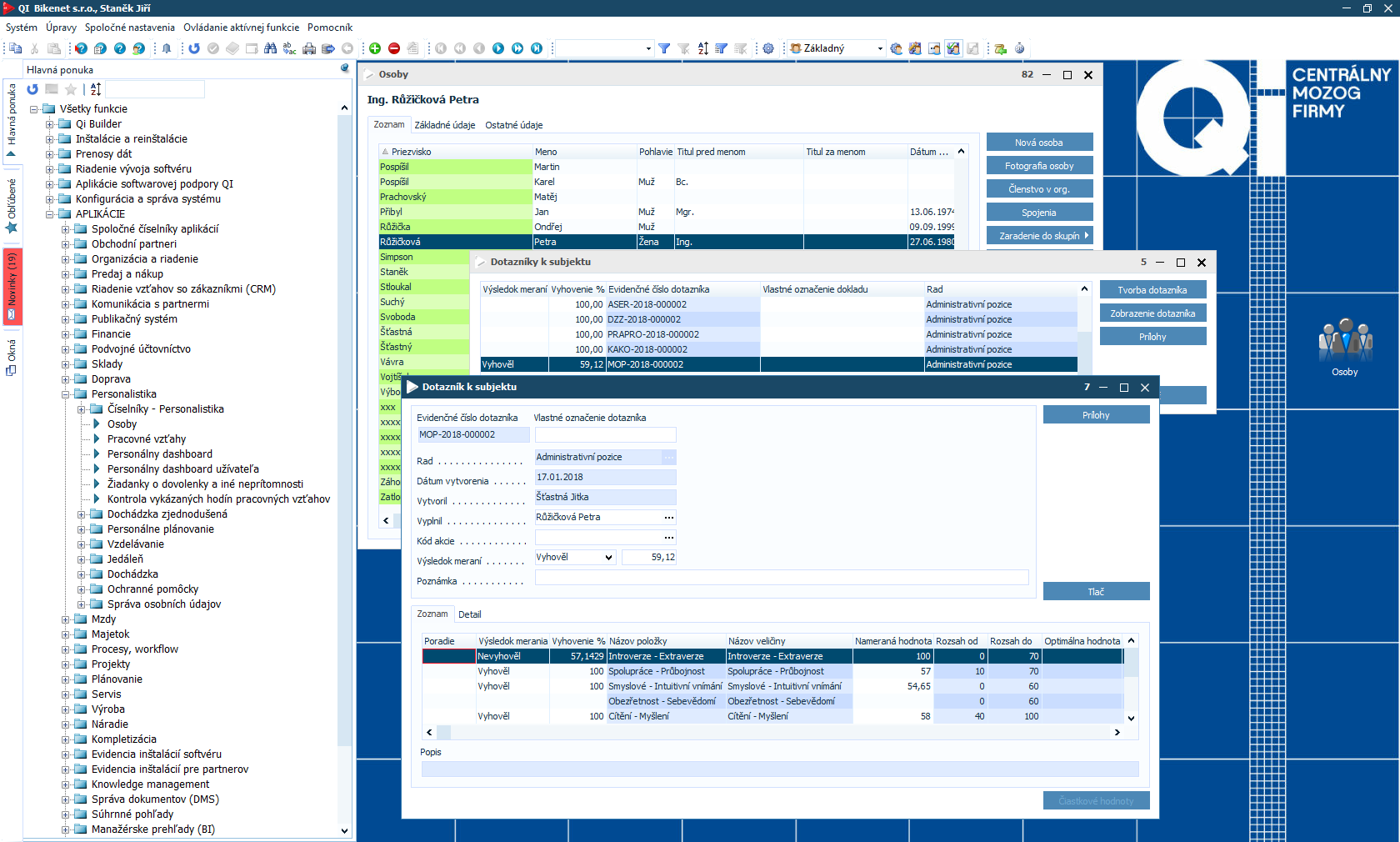 Špecializovaná obchodná jednotka Personálne psychometrické dotazníky a testy zaručia prehľad o kandidátoch do výberového konania aj existujúcich pracovníkoch vrátane informácií o osobnosti, pracovnej motivácii, schopnosti zvládať záťaž alebo manažérskom štýle. Respondentom jednoducho (tiež cez kontakty v QI) zašlete dotazníky, ktoré slúžia na diagnostiku osobnostných a pracovných charakteristík. Ti ich vyplnia prostredníctvom webovej aplikácie – prístup sa realizuje cez unikátnu URL adresu zaslanú e-mailom. Výsledky sa prenesú do QI vrátane výstupnej správy vo formáte PDF. Všetky dotazníky sa vyvíjajú podľa štandardov EFPA (European Federation of Psychologists´ Associations).