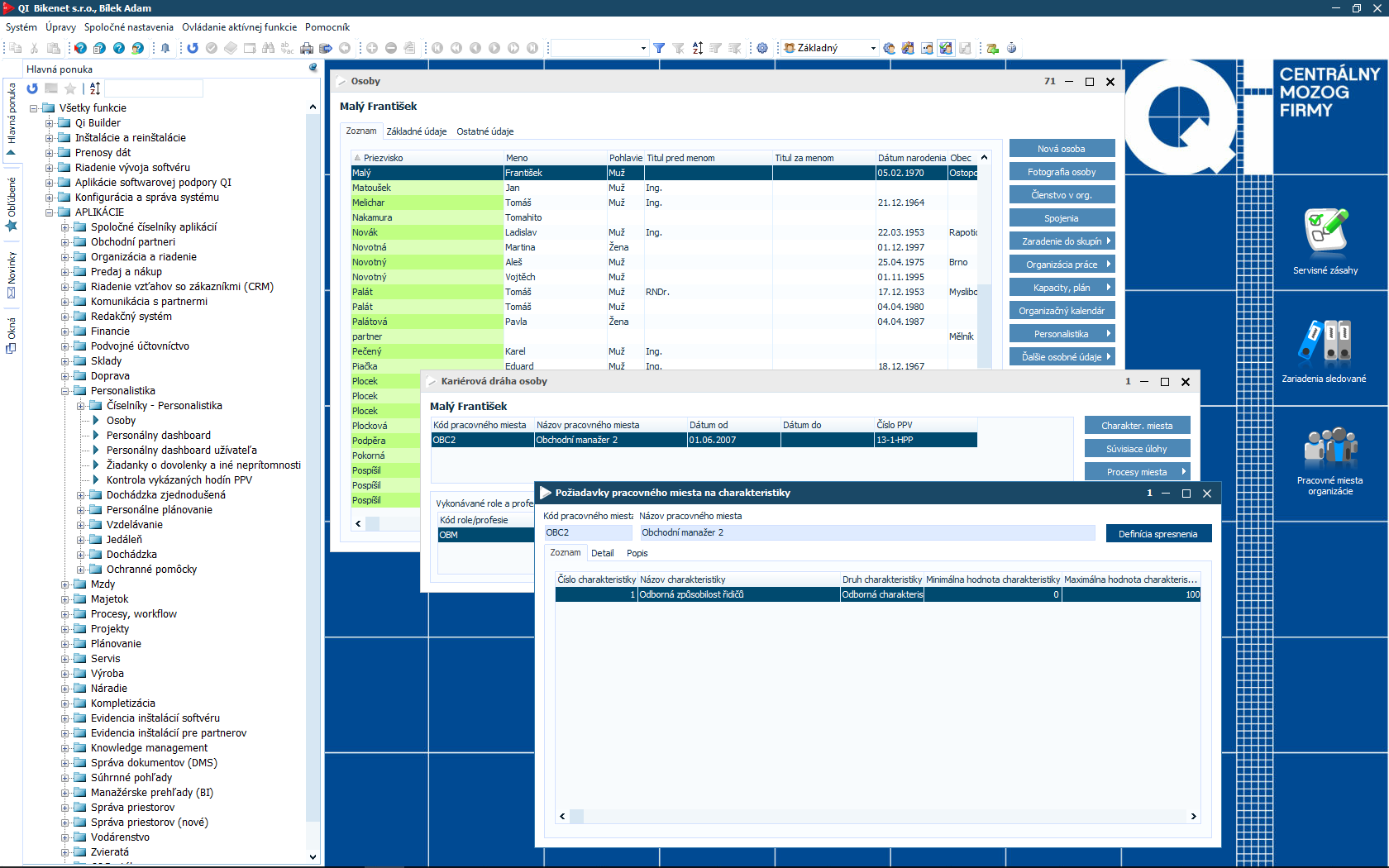 Modul pokryje všetky personálne operácie od zabezpečenia zamestnaneckej evidencie až po analýzu a ohodnotenie výkonov. Všetky údaje môžu byť využité pri spracovaní miezd. V QI tiež ľahko nastavíte plán pre edukáciu zamestnancov a zvyšovanie ich kvalifikácie. To všetko vrátane odhadu aj vyhodnotenia finančných nákladov na jednotlivé akcie. QI tiež predkladá informácie o voľných pracovných miestach aj uchádzačoch o zamestnanie. Možno v ňom zostavovať výhľadový plán pre navýšenie kapacít alebo prípadné zoštíhlenie štruktúr a zníženie stavov.