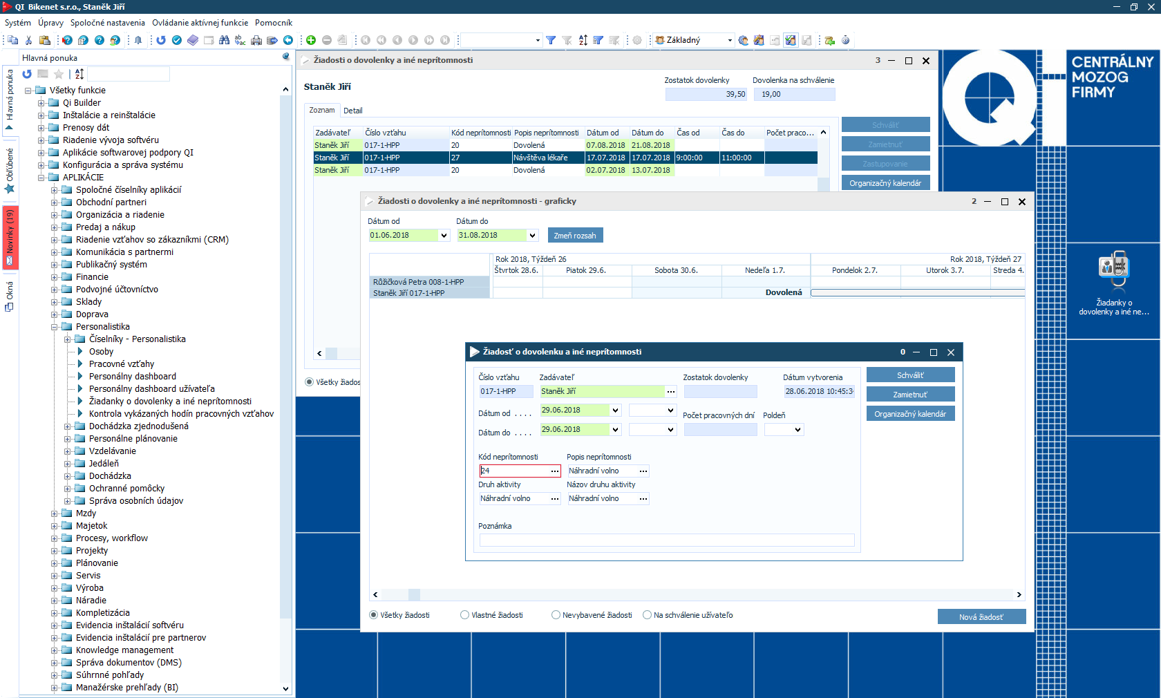 Zamestnanci môžu o dovolenku žiadať priamo v QI, tú potom možno potvrdiť, alebo zamietnuť rovno z kancelárie jediným klikom. Každý termín zobrazíte v nadväznosti na firemné kapacity. Systém potom automaticky zašle konkrétnemu pracovníkovi e-mail s informáciou, ako bola žiadosť vybavená. S QI odpadá aj zložité počítanie príspevkov na stravu – z jedného formulára presne zistíte, na koľko stravných lístkov má kto nárok.