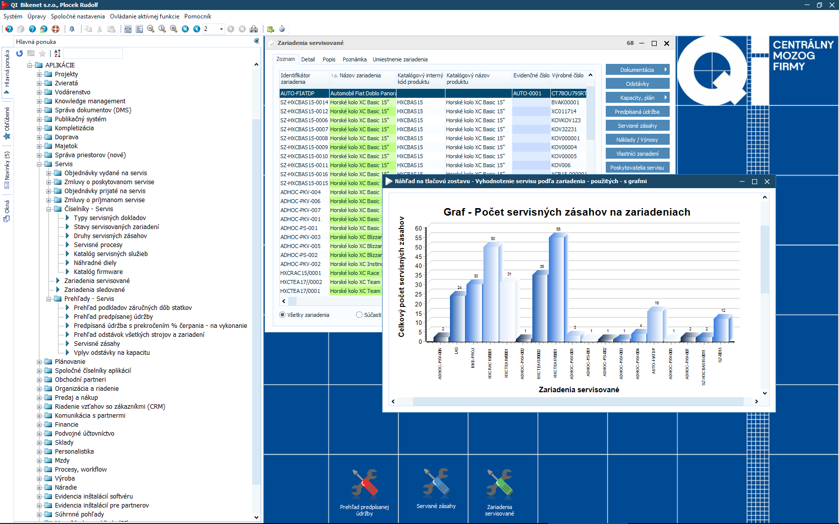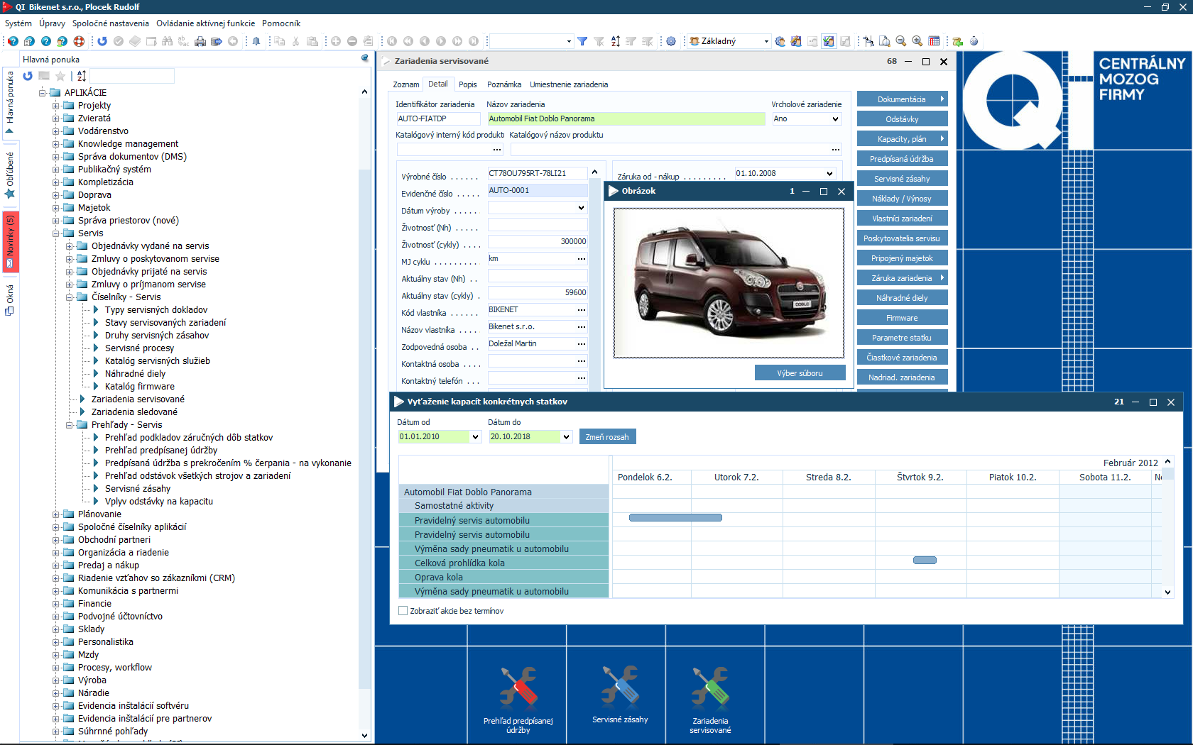 Výrobné stroje, výpočtová technika, automobily alebo trebárs projektory – informačný systém pomôže spravovať všetky firemné zariadenia. Podáva prehľad o priebehu opráv, porovnáva zamýšľané a skutočné náklady na servis alebo pomôže so zmluvným zabezpečením týchto procesov. Tiež s ním môžete sledovať odstávky strojov. QI dodáva aj príslušné štatistiky, podľa ktorých je jednoduché vyhodnotiť, či je oprava ešte efektívna.