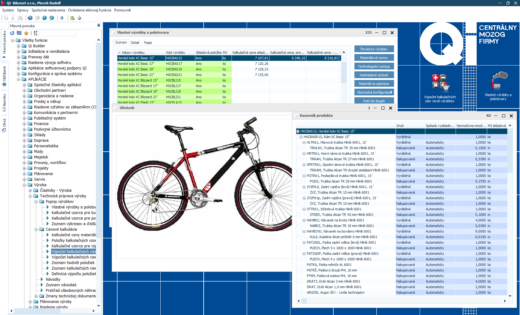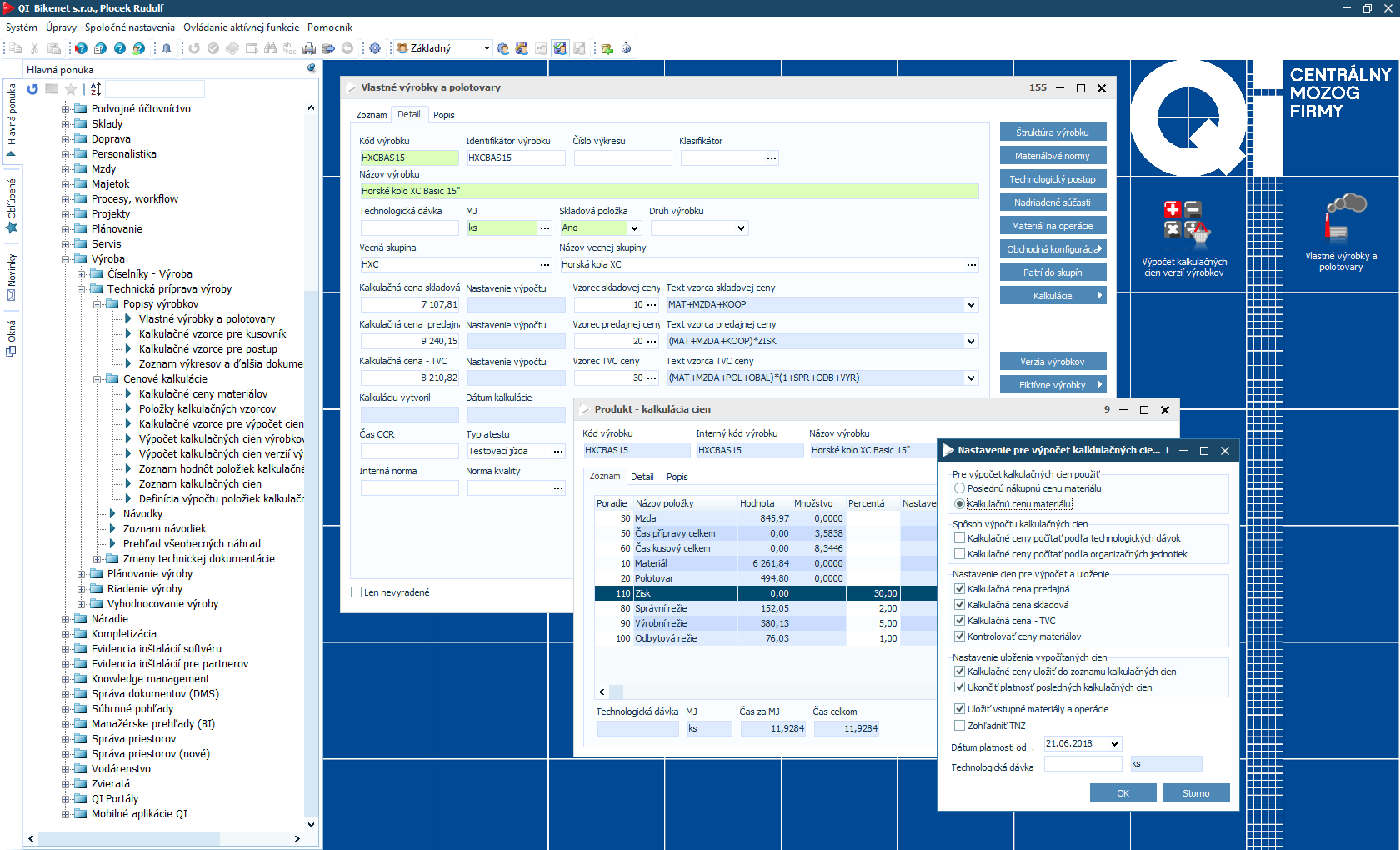 V QI môžete evidovať neobmedzené množstvo rôznych výrobkov. Priamo v systéme možno definovať vzhľad produktu, jeho presné zloženie aj jednotlivé operácie (ku každej je k dispozícii zodpovedajúci technologický postup) vrátane prípravného aj kusového času. Vďaka tomu vedenie získa informácie o vyťažení konkrétneho pracoviska. QI tiež eviduje všetky potrebné materiály, vždy je možné vypočítať ich spotrebu. Na to nadväzujú predvýrobné kalkulácie. Zistíte, či produkt dokážete vyrobiť v prijateľnej hodnote a jednoducho porovnáte plánované náklady so skutočnými. Nákladové ceny možno premietať priamo do ponúk. V QI môžete tvoriť vlastné kalkulačné vzorce pre koncovú predajnú cenu.